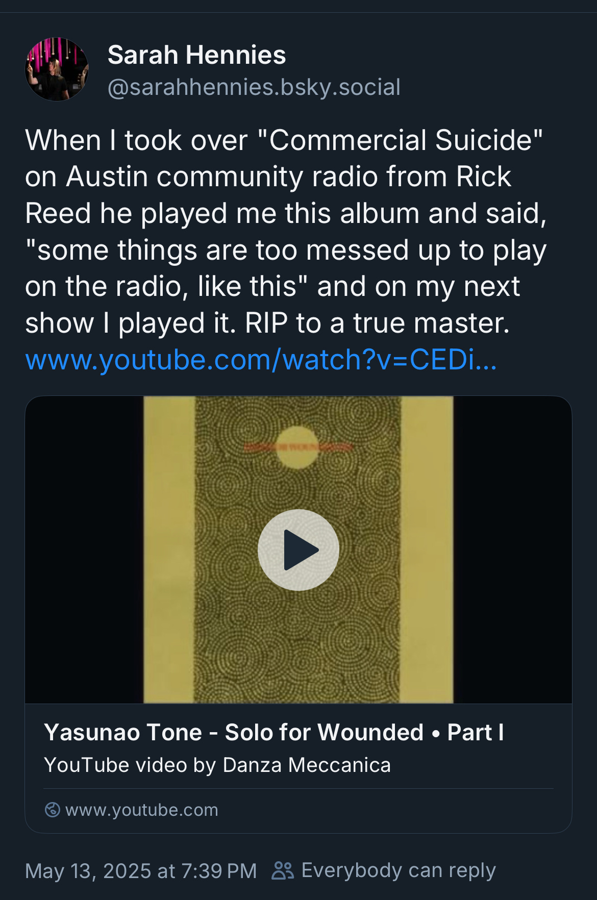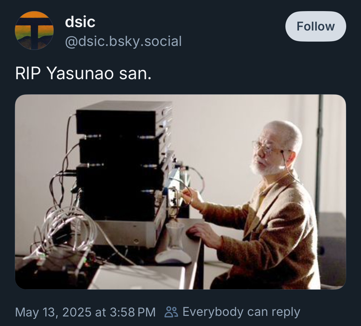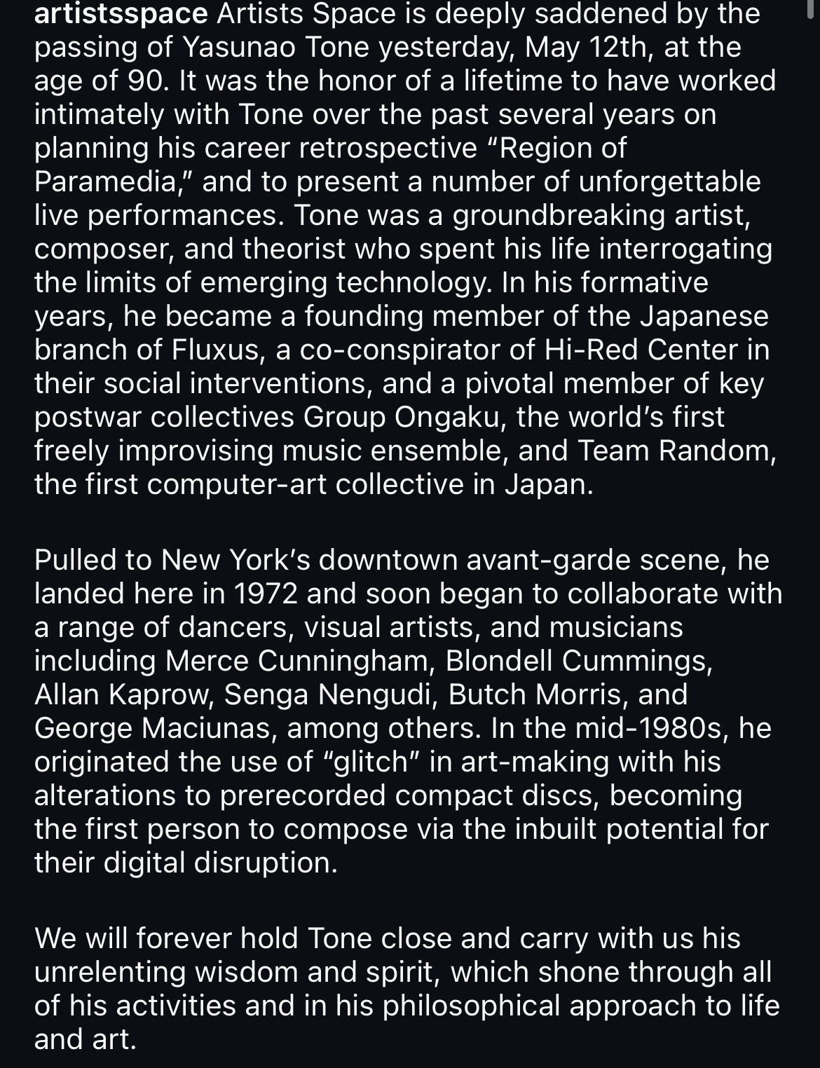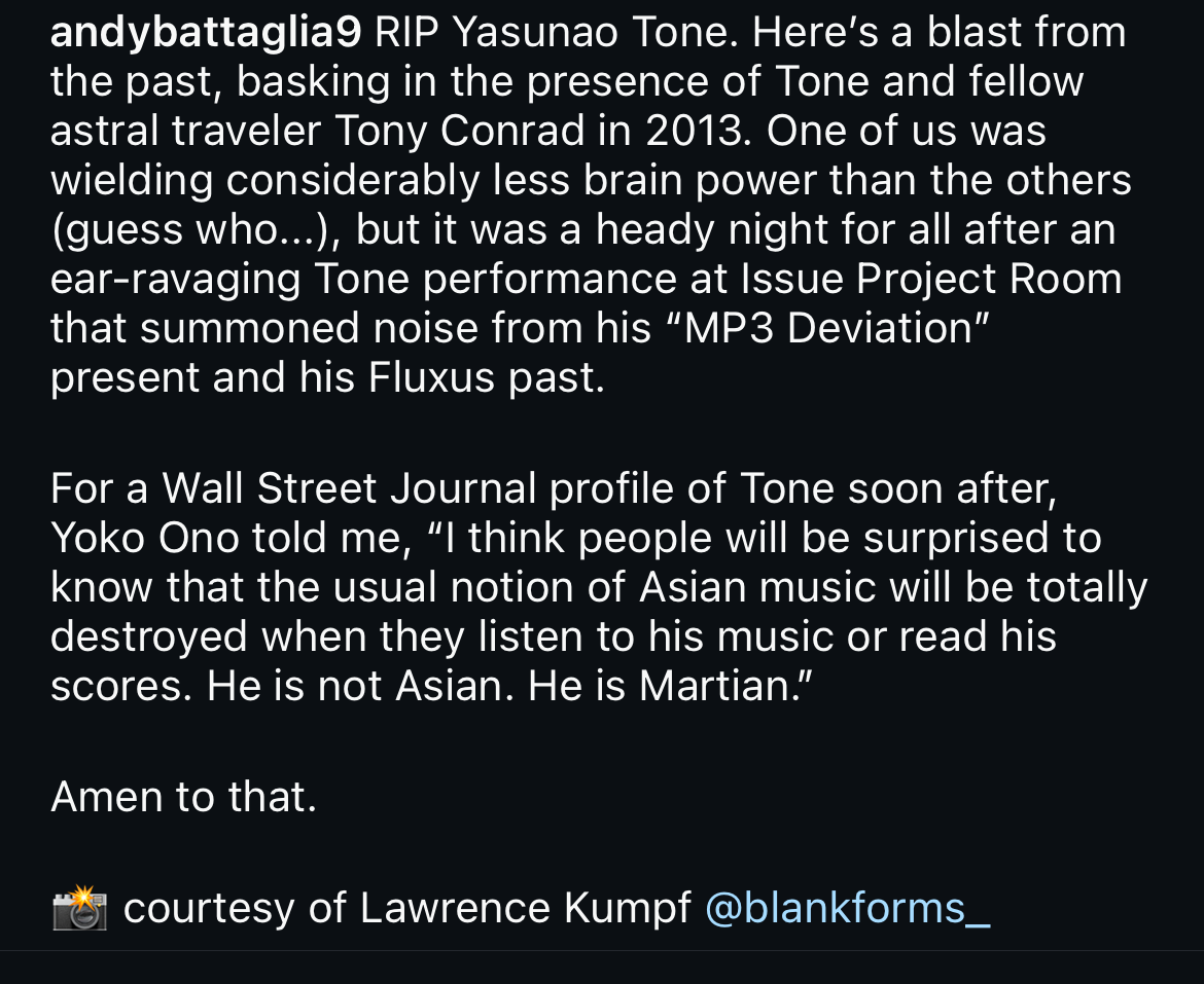 Thanks for the great report on Yasunao Tone's life & work - he will be greatly missed.