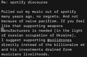 Criticism of Spotify has long been rife in the blogosphere. “Being on a streaming platform that pays musicians so unfairly has always been annoying, but somehow I could live with it,” is a typical example (@thebluesagainstyouth) generally followed by a variation on the following, “Daniel Ek’s investments in AI weapons cross a line for me” (@sleeppartypeople).