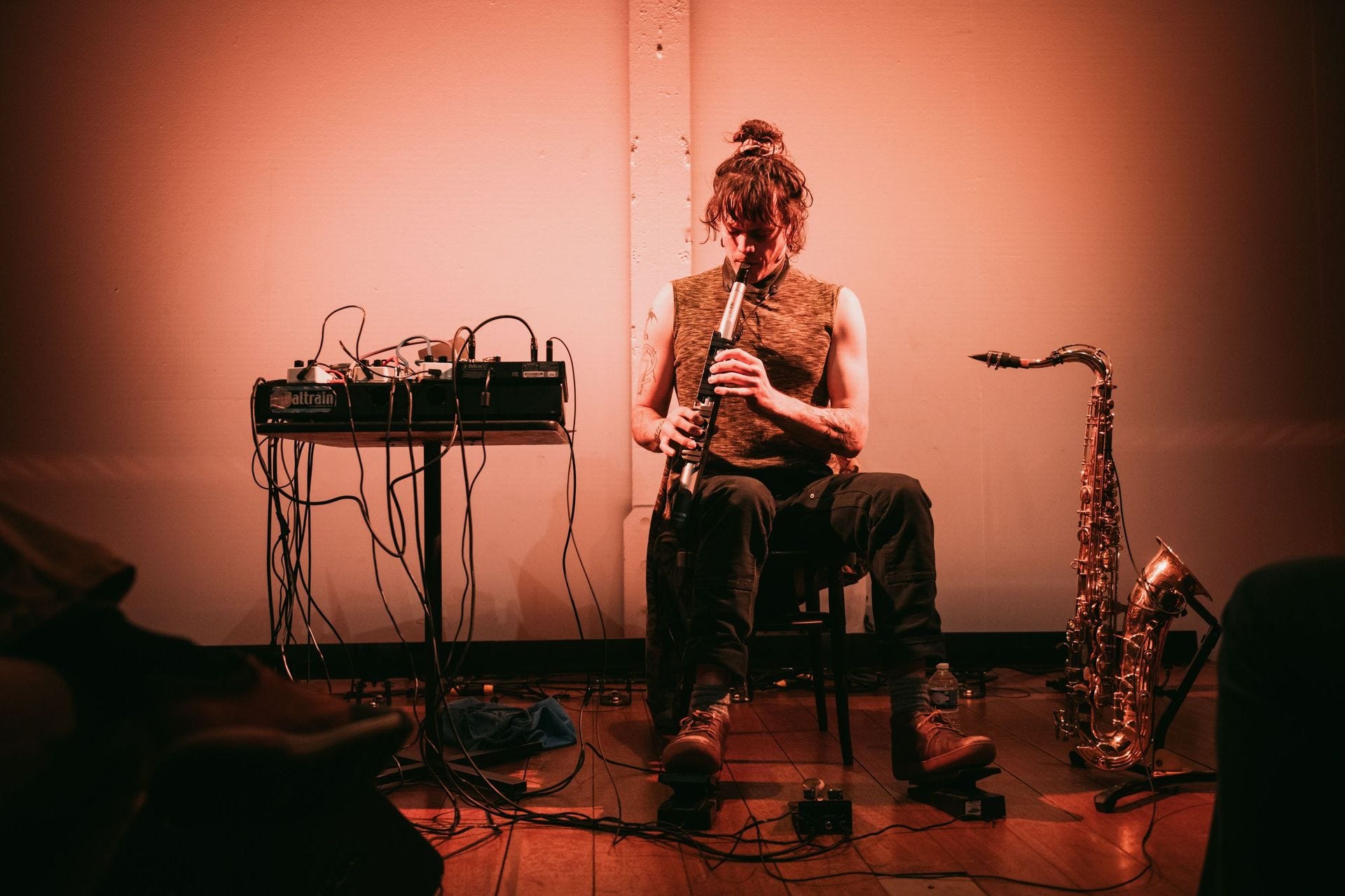 Throughout, Pulice’s enduring fascinations remain audible: tight harmonic clusters inherited from their years arranging for the nine-piece Afrobeat band Black Market Brass, now rendered even denser through expression pedal control; a love of the “minutia of spaces between the notes”; and a commitment to process that avoids the obvious crutch of looping pedals in favor of tools that “expand the expression” of what’s being played. The Yamaha WX5 wind synth, a late ‘80s rig Pulice learned about from a friend, adds further textural range, sending both audio and MIDI for a “kaleidoscopic use” of data and sound sources.