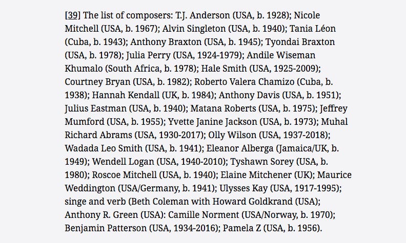 In 2020, a list compiled by scholar, composer, and trombonist George Lewis went viral, a list of black composers whose work has never been programmed by the Darmstadt. The center of New Music in the 20th century had only included three Afrodiasporic artists or performers until recently, prompting Lewis’s list. In “A Small Act of Curation,” Lewis writes