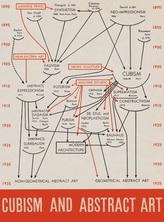 Lists have a complicated but often venerated role in the history of 20th century art and music. The first director of New York’s Museum of Modern Art, Alfred Barr, famously portrayed the web of modern art in his ‘Cubism and Abstract Art Diagram’ in 1936. Barr’s “Cubism and Abstract Art Diagram” eventually came to be criticized for being excessively teleological.
