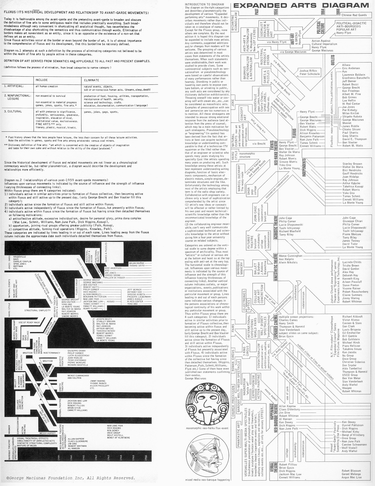 Fluxus pioneer George Maciunas achieved something much more ambitious with his intermedia Expanded Arts Diagram in 1966, in which Fluxus was the focal point. Maciunas’ list-image is a relational digram, with its explicit articulations of connection between various actors and movements.