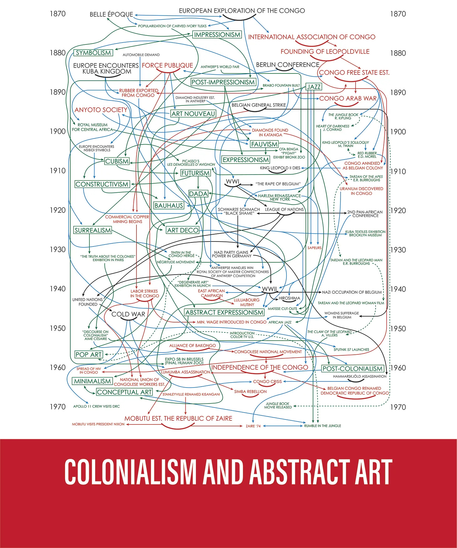 Relational webs of influence have become one of the defining modes of visualization in contemporary digital culture. MoMA explains, “Vectors connect individuals whose acquaintance with one another in the period 1910–1925 could be documented. The names in red represent those figures with the most number of connections within this group.” Part of what is so interesting here is the broadening of the narrative beyond received narratives. Hrag again: “This web of relationships goes beyond visual art to incorporate musicians like Claude Debussy, writers like Guillaume Apollinaire, and choreographers like Vaslav Nijinsky, and gives us the most complete picture of abstractions transcontinental roots we’ve ever seen.” Hrag also wonders if this image will become as iconic as Barr’s. While I accept their usefulness as tools, such visualizations fail as visual diagrams. They’re not iconic, but instantly dated. (Hyperallergic)