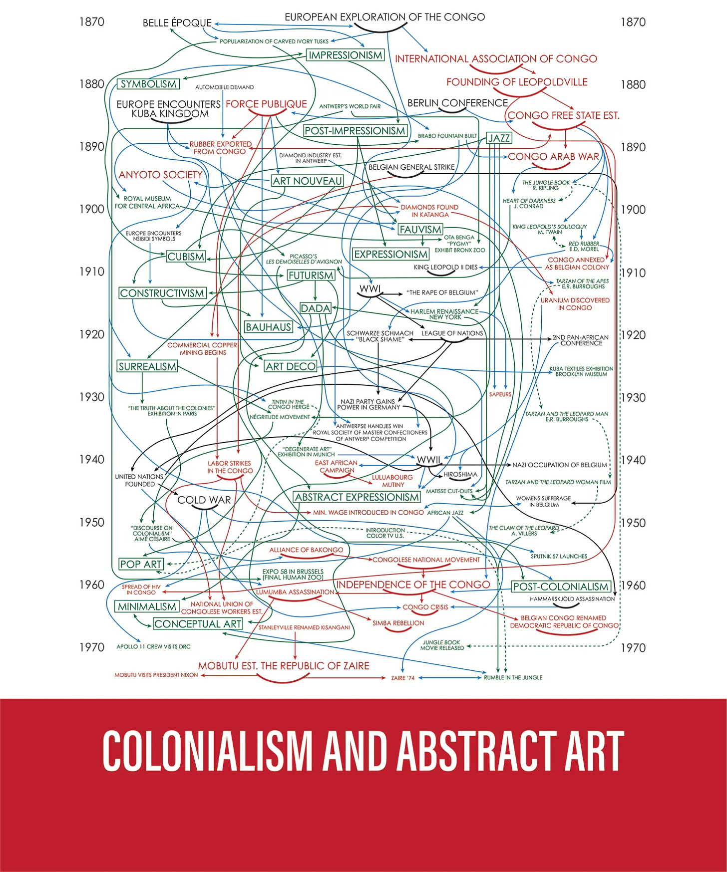 Hank Willis Thomas gave the list a ‘postcolonial update’, revealing the colonial assumptions that have been reproduced by the power of MoMA. As Hrag Vartanian writes, “Like colonialism itself, this version of history is in service of one thing: justifying the dominance of modern European civilization, even if, as in this case, it is focused on a particular cultural movement.” (Hyperallergic) Thomas’s update draws attention to the way Modernism found influence in non-Western cultures and practices while simultaneously erasing those influences.