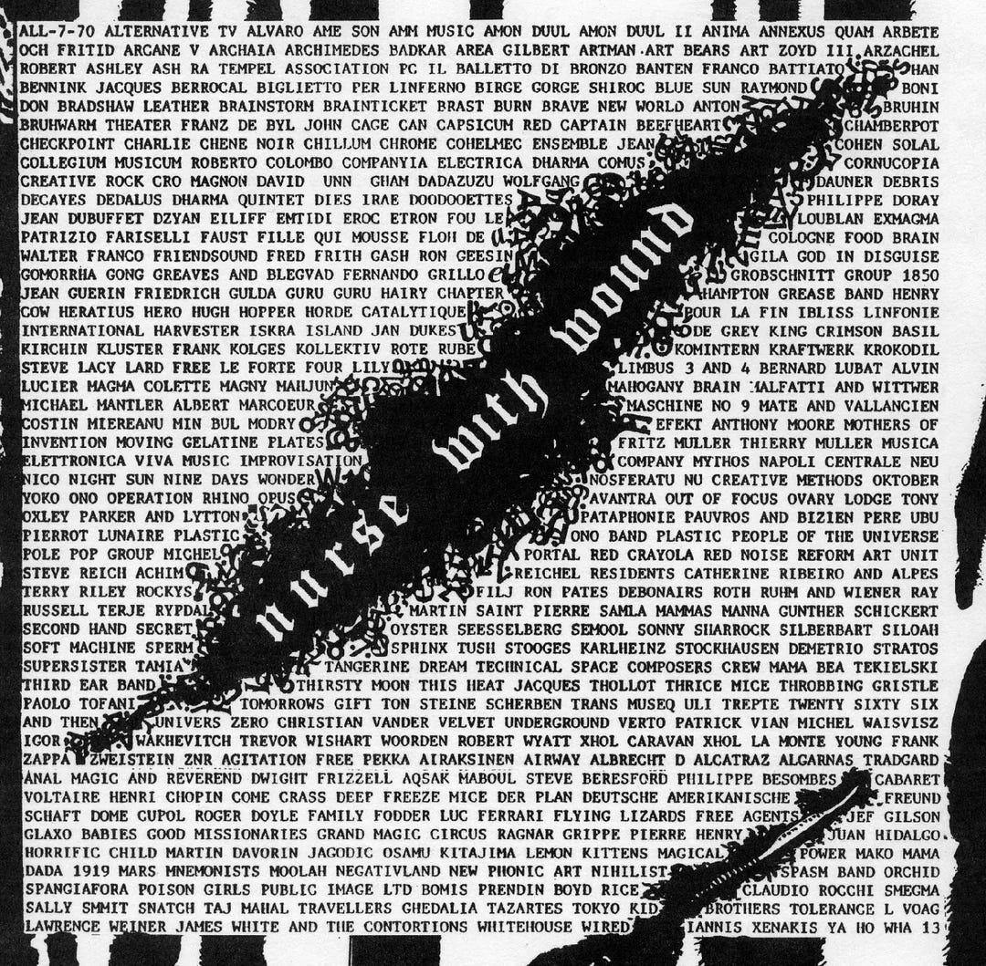 The avant-garde genealogy implied by the List invites an historiographic reading, taking into account how changing social conditions have altered what counts as music and which lineages register as influences. One of the most striking aspects of the Nurse List is the near total absence of Black artists—a fact which commentators consistently fail to comment on. Though the influence of Black radical music is apparent in various ways, I find this omission to be indicative of a broader problematic of cultural appropriation in Euro-American avant-garde practice. In my unpublished paper, I read the open “wound” tearing across the image of the List as an invitation to reconsider the “whiteness” of the avant-garde in relation to the Black radical tradition. I argue that in fact the music of NWW shares certain formal qualities with the music of artists excluded and omitted in the construction of such a historical narrative (namely dub, free jazz, and hip-hop), and look to socio-cultural factors that have sustained these arbitrary categorizations. (Joseph Sannicandro)